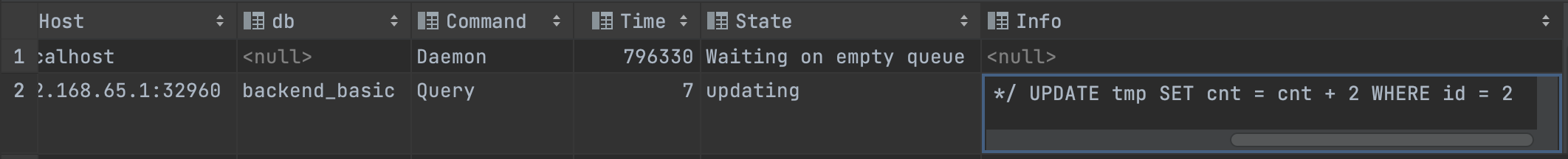 MySQL thread id 10, OS thread handle 281472163827456, query id 115 192.168.65.1 root updating